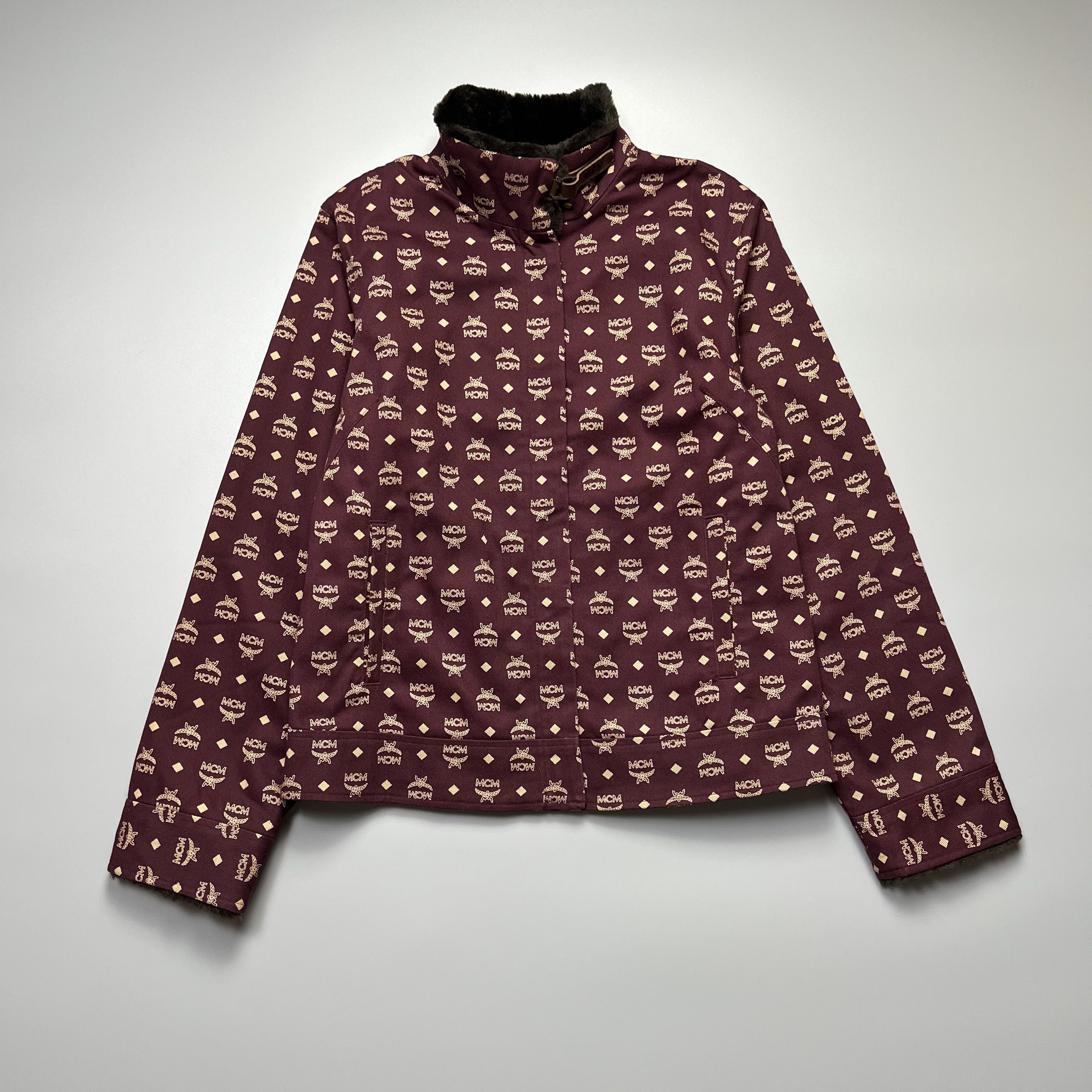 Mcm - Monogram Fur Collar and Wrist - Jacket Size: Large (Womens) Length: 24 Width: 19.5 Shoulder: 16 Sleeves: 24 Hem: 20 Color: Burgundy (Wine Maroon) Conditions: Can passed to 9.3/10 Conditions, No Pinhole and Scratches on Fabric. But it has a Leather pilling on Neck only can be seen on last Photo. I think this is a vintage release but in Pristine condition of usage