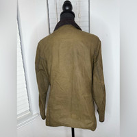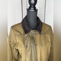 Stylish Barbour jacket. Olive green with a brown collar. Features front pockets and button closure.