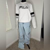 White Fila sweatshirt with black and gray details. Paired with light blue jeans.