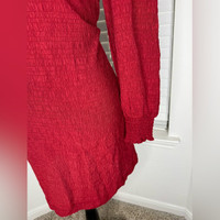 Chic red dress with textured fabric. Features long sleeves and a V-neckline. Perfect for stylish outings.