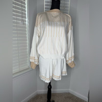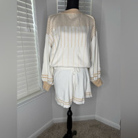 Cozy lounge set with cream and tan stripes. Features a comfortable top and shorts.