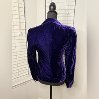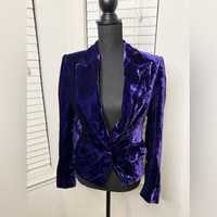 Luxurious velvet blazer in deep purple. Sharp tailoring and elegant design. Perfect for sophisticated style.