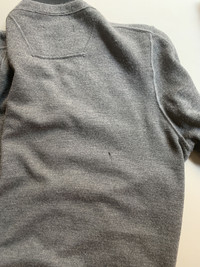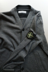 Classic Stone Island gray 100% wool cardigan. Has all the buttons and a spare button. Rare size small. Please note there are two small holes, one in the front and one in the back (see last two pics).