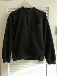 MUJI LABO Size: S-M Unisex Black ribbed overshirt with side pockets Fits slightly boxy/oversized Snap buttons 100% Polyester Only worn a couple of times, not for me