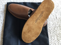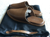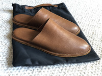 BRAND NEW WITH TAGS GORGEOUS PEBBLED LEATHER SOFT AND SMOOTH SUEDE SOLES Heel to toe = 11 6/8" Your feet spend a lot of time at home, don’t they deserve to be treated well? Luxurious Larsen Slippers are a cradle for your feet, specially designed to provide warmth, comfort and convenience. Slipping into a pair is like slipping under a secure, extra cozy blanket. Whether you’re just rolling out of bed, or lounging around the house, they will always feel and look fantastic. Strong and durable, nappy water-repellent suede makes the ideal sole for the Larsen Slippers. Its natural traction will keep you safe no matter what types of flooring, or carpeting you wear them on.