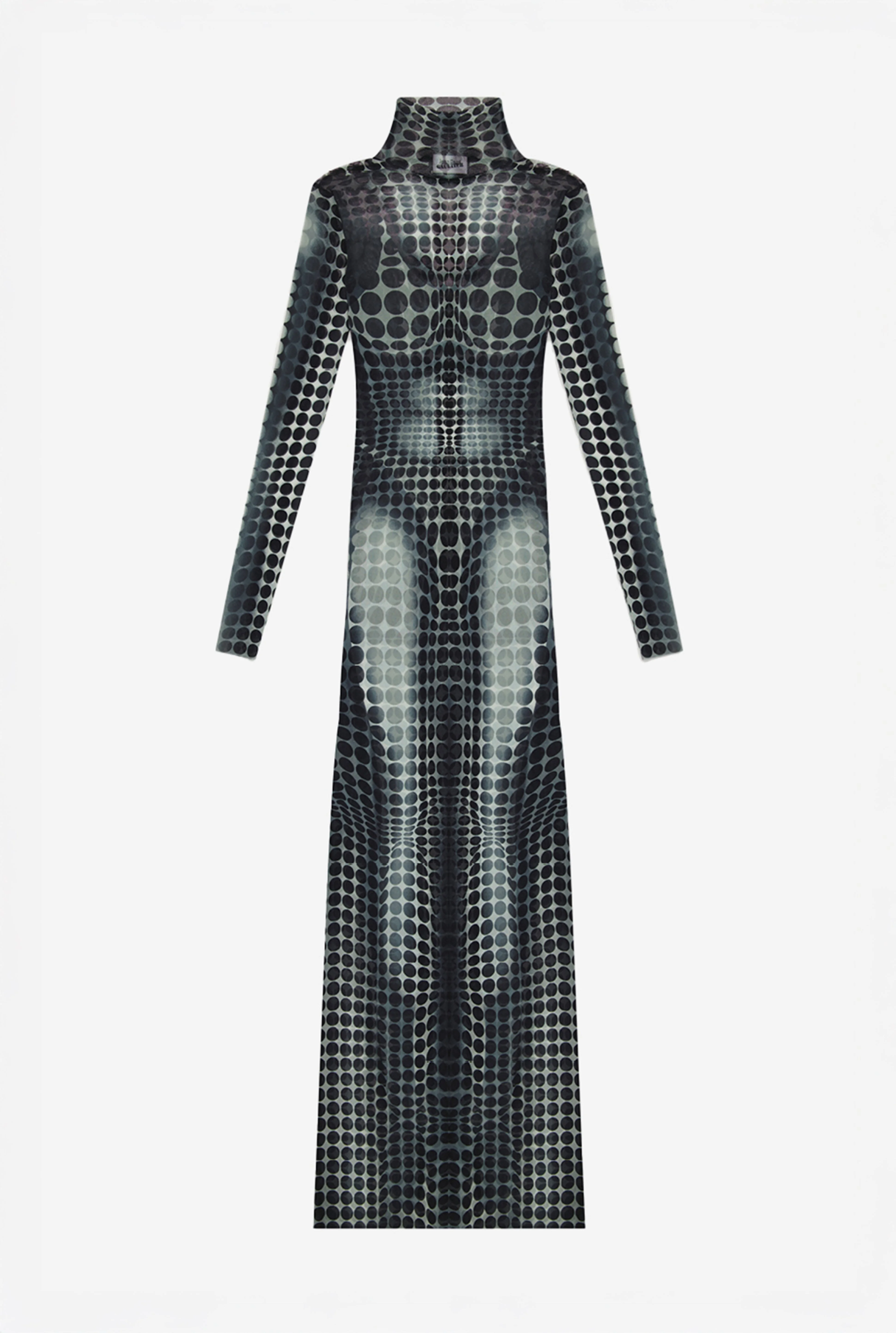 Tight long tulle dress with a dots print. PRODUCT DETAILS - Stretchy fit - Turtleneck - Long sleeves - Material: 100% polyamide - Made in Italy - Reference: 26/01-W-DR131-M018P-010200