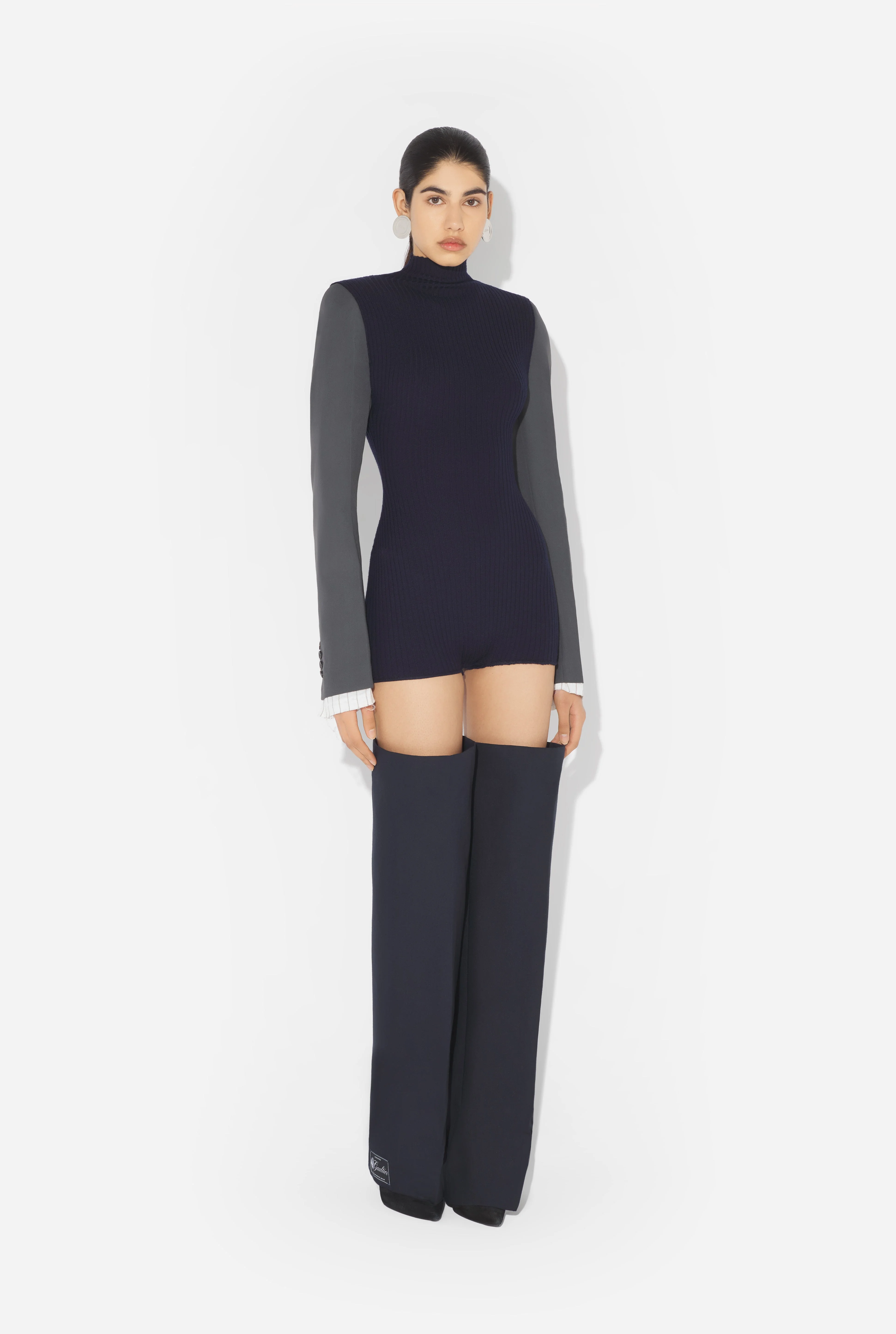 Navy ribbed merino wool short bodysuit with gray suit sleeves and tennis-striped shirt finishes. PRODUCT DETAILS - Semi-slim fit - Mock turtleneck - Plastron underlayer with shoulder pads - Wool-covered button fastening in back - Long suit sleeves with shirt finishes - Discreet Jean Paul Gaultier label on left-hand shirt finish - Main material: 100% merino wool - Secondary materials: 77% polyester, 23% virgin wool - Made in Italy - 25/04-W-PO037-K017-5904