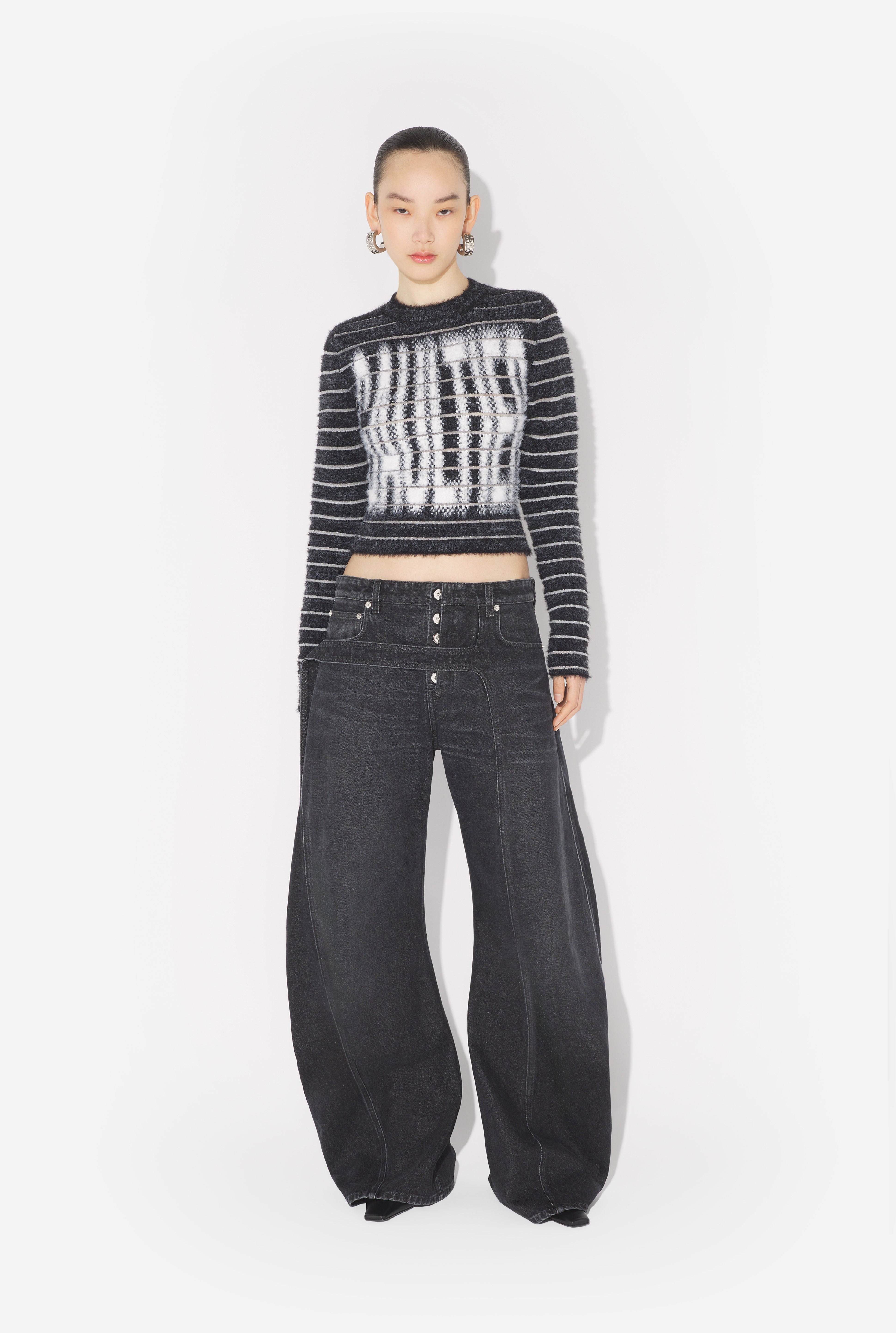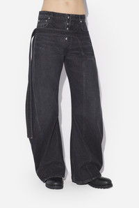 Black denim jeans with strap detail in front and Jean Paul Gaultier label in back. PRODUCT DETAILS - Loose fit - Five pockets - Belt loops - Engraved Jean Paul Gaultier buttons - Engraved Jean Paul Gaultier rivets - Material: 100% cotton - Made in Italy - Reference : 25/03-W-TR022-D016-06