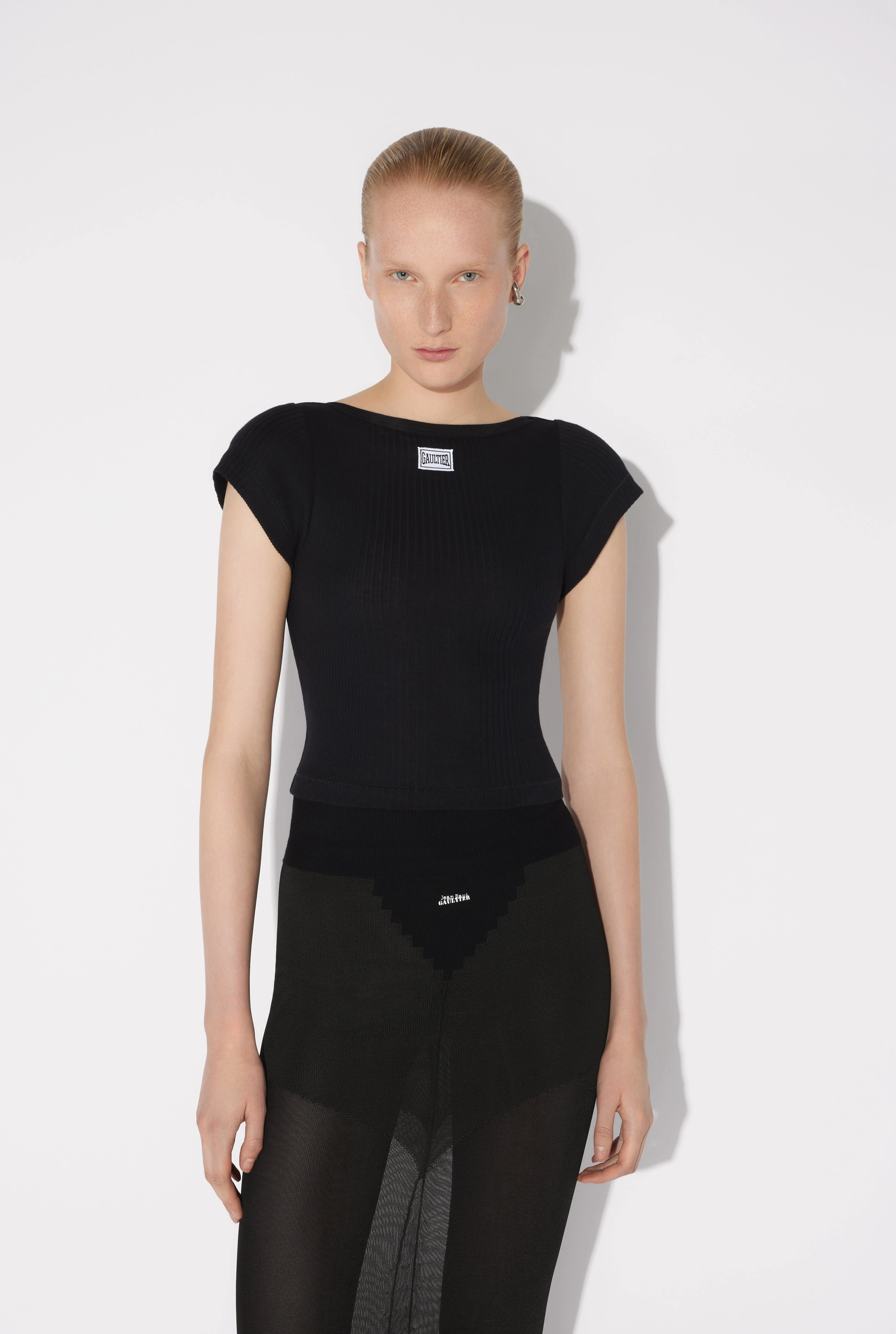 Cropped black cotton T-shirt with Gaultier patch below the neckline. PRODUCT DETAILS - Tight fit - Crew neck - Materials: 100% cotton - Made in Bulgaria - Reference: 25/33-F-TS105P-J054-00
