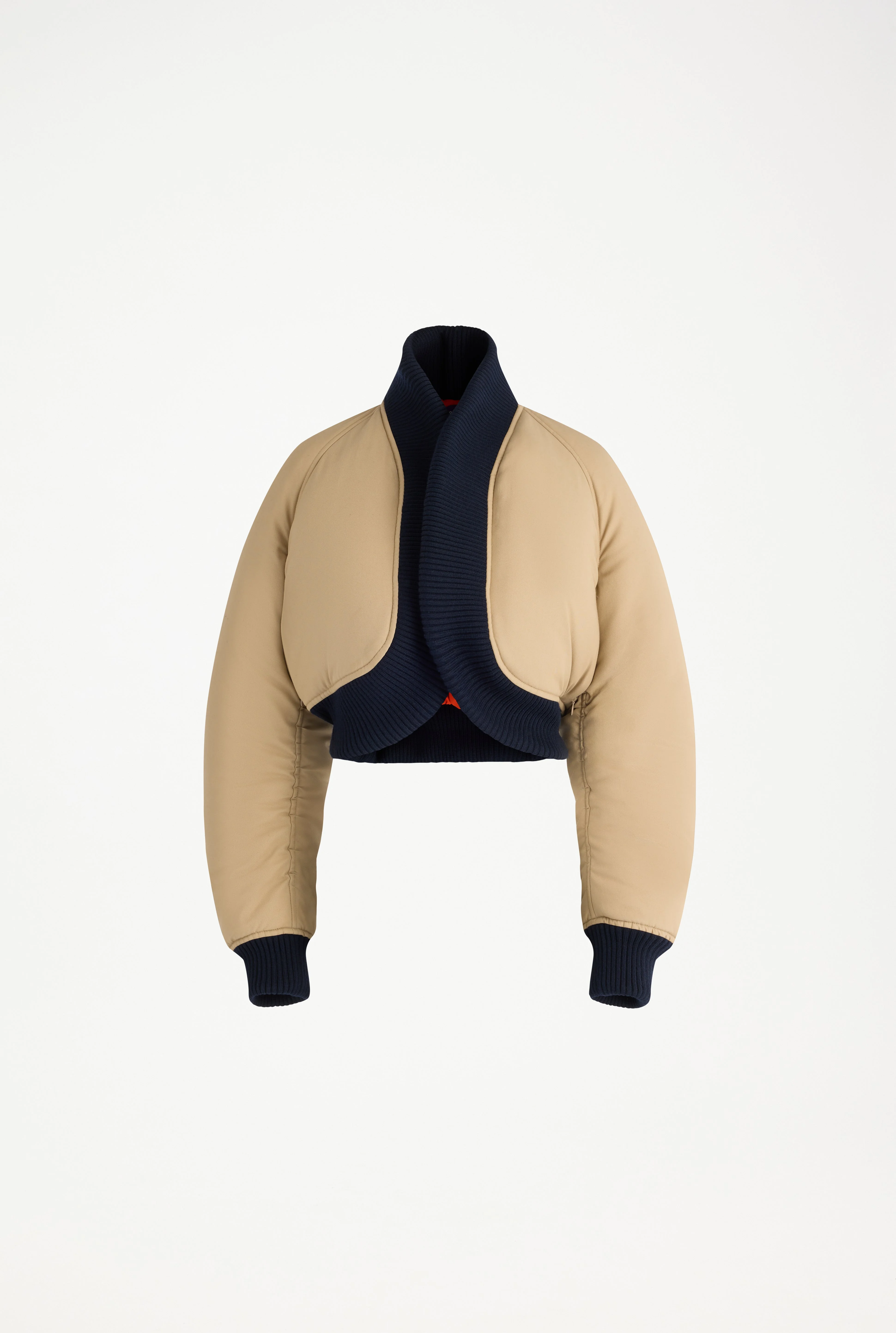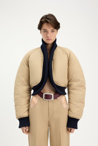 Beige cotton bomber jacket with navy-blue ribbed edging.