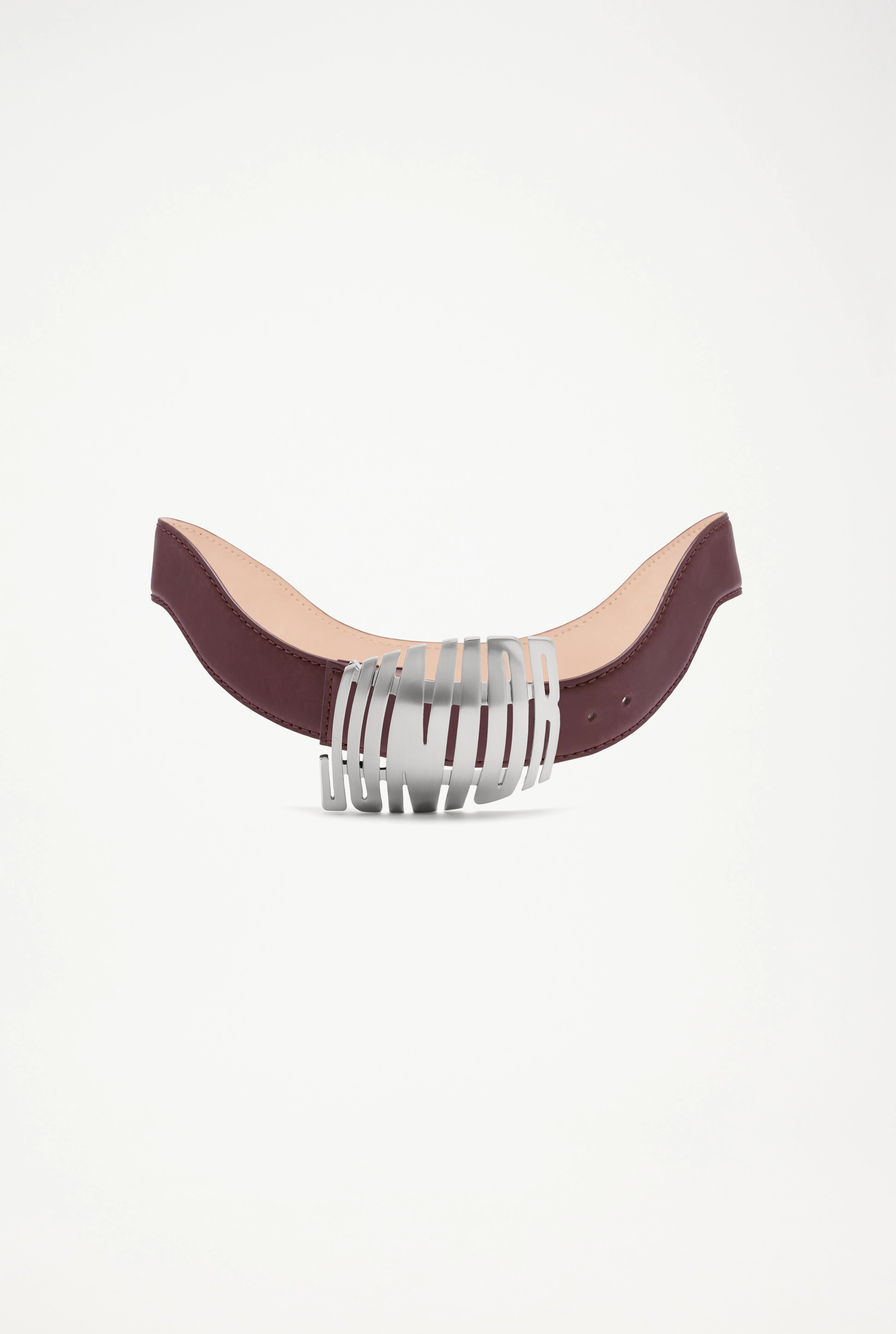 Curved burgundy leather belt with metal “Junior” logo buckle.
