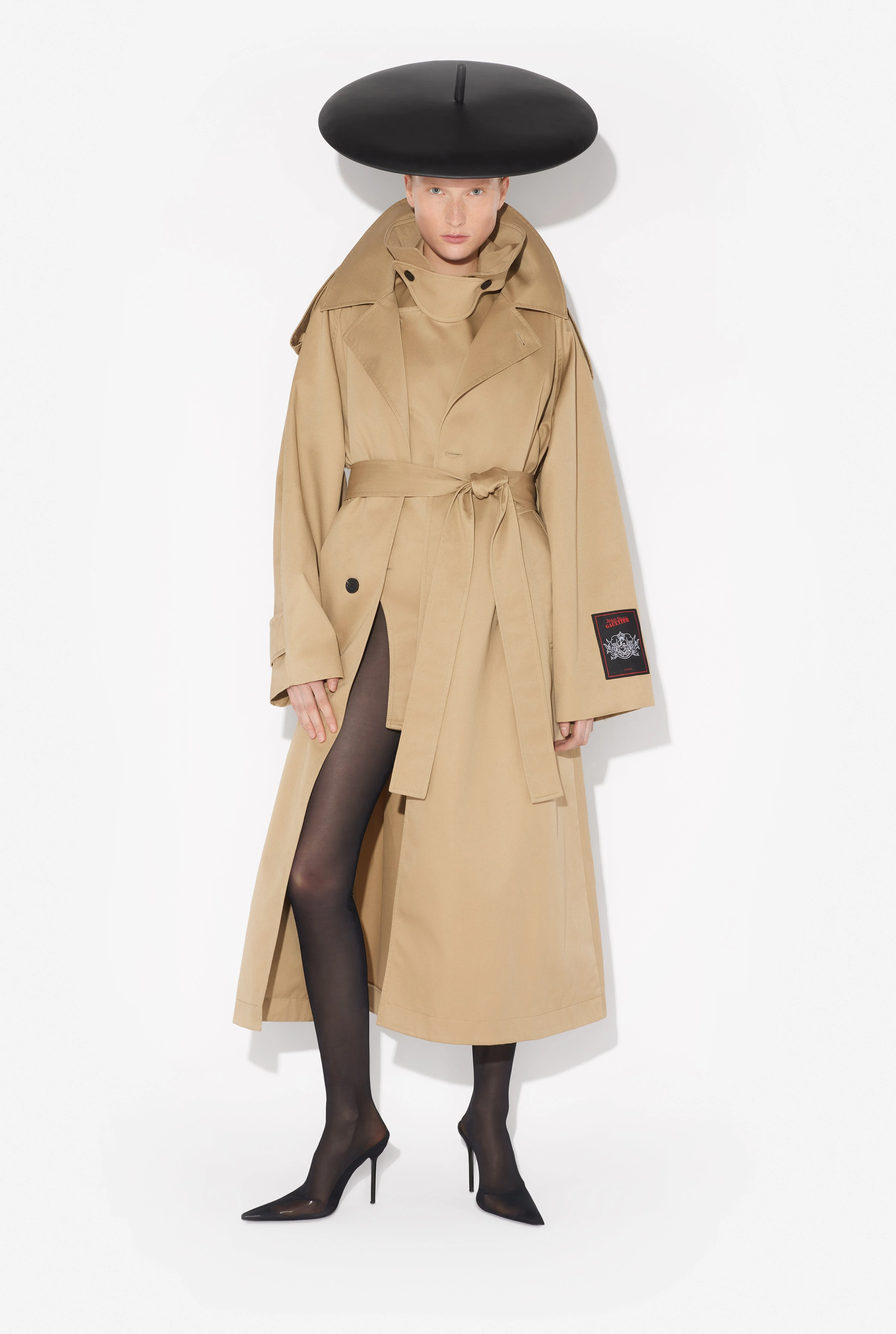 Beige cotton twill trench coat with bodysuit details and Jean Paul Gaultier label on the sleeve. PRODUCT DETAILS - Loose fit - Button fastening - Two pockets - Straps at shoulders - Main material: 65% polyester, 35% cotton - Sleeve lining: 100% viscose - Body lining: 100% cotton - Made in Italy - Reference: 25/33-F-MA034E-C072-68
