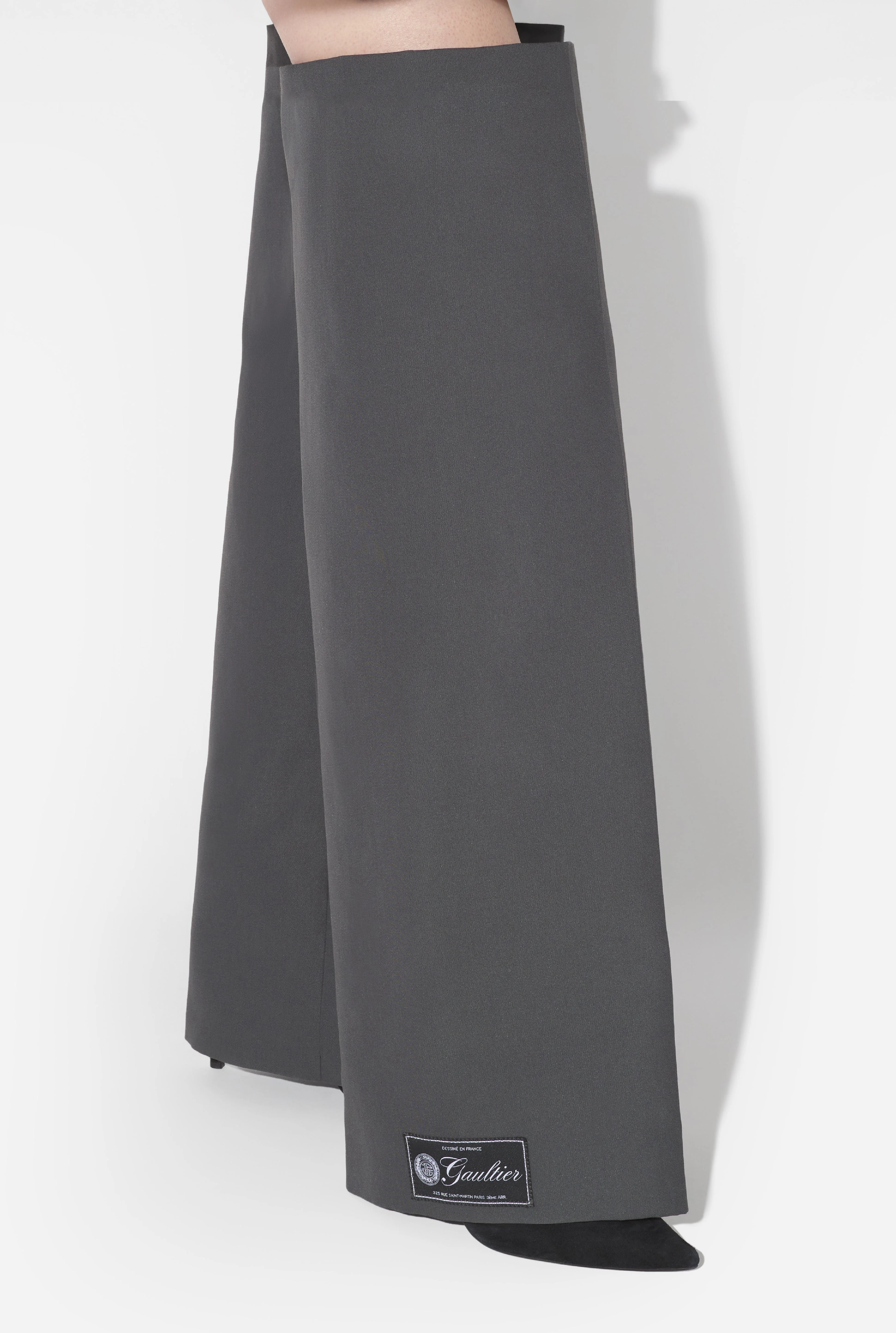 Gray suit gaiters with Jean Paul Gaultier label. PRODUCT DETAILS - Elastic band to hold gaiters in place - Mid-thigh height - Floating effect - Materials: 77% polyester, 23% virgin wool - Lining: 100% viscose - Made in Italy - 25/04-W-AC036-W040-04