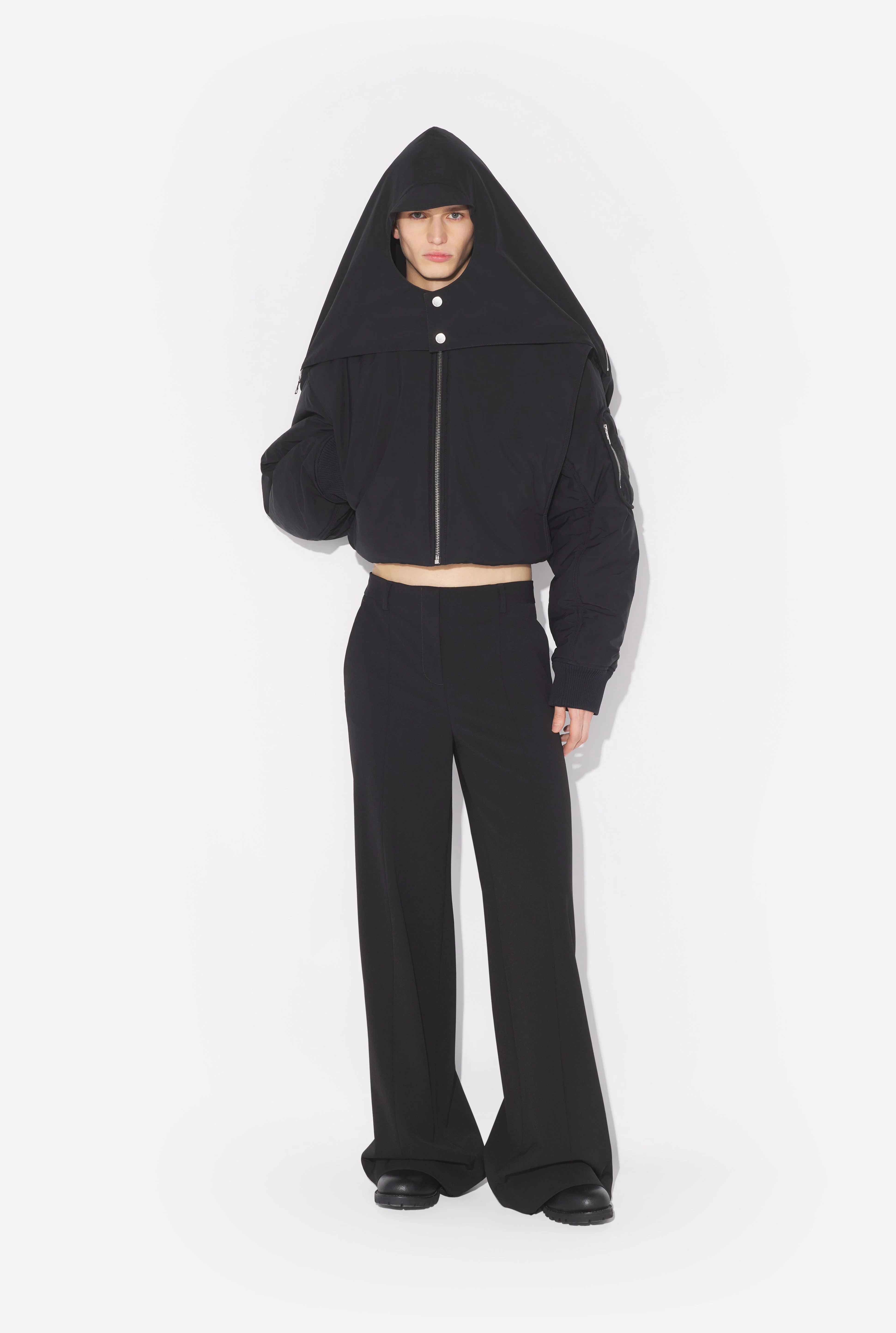 Black nylon bomber jacket with zipper fastening in back and built-in hood. PRODUCT DETAILS - Boxy fit - Two zipper fastenings with Jean Paul Gaultier engraving, in front and back - Two flat pockets in front - One zippered pocket on left sleeve with Jean Paul Gaultier logo - Materials: 52% polyamide, 48% polyester - Made in Italy - Reference : 25/03-U-OU005-W007-00