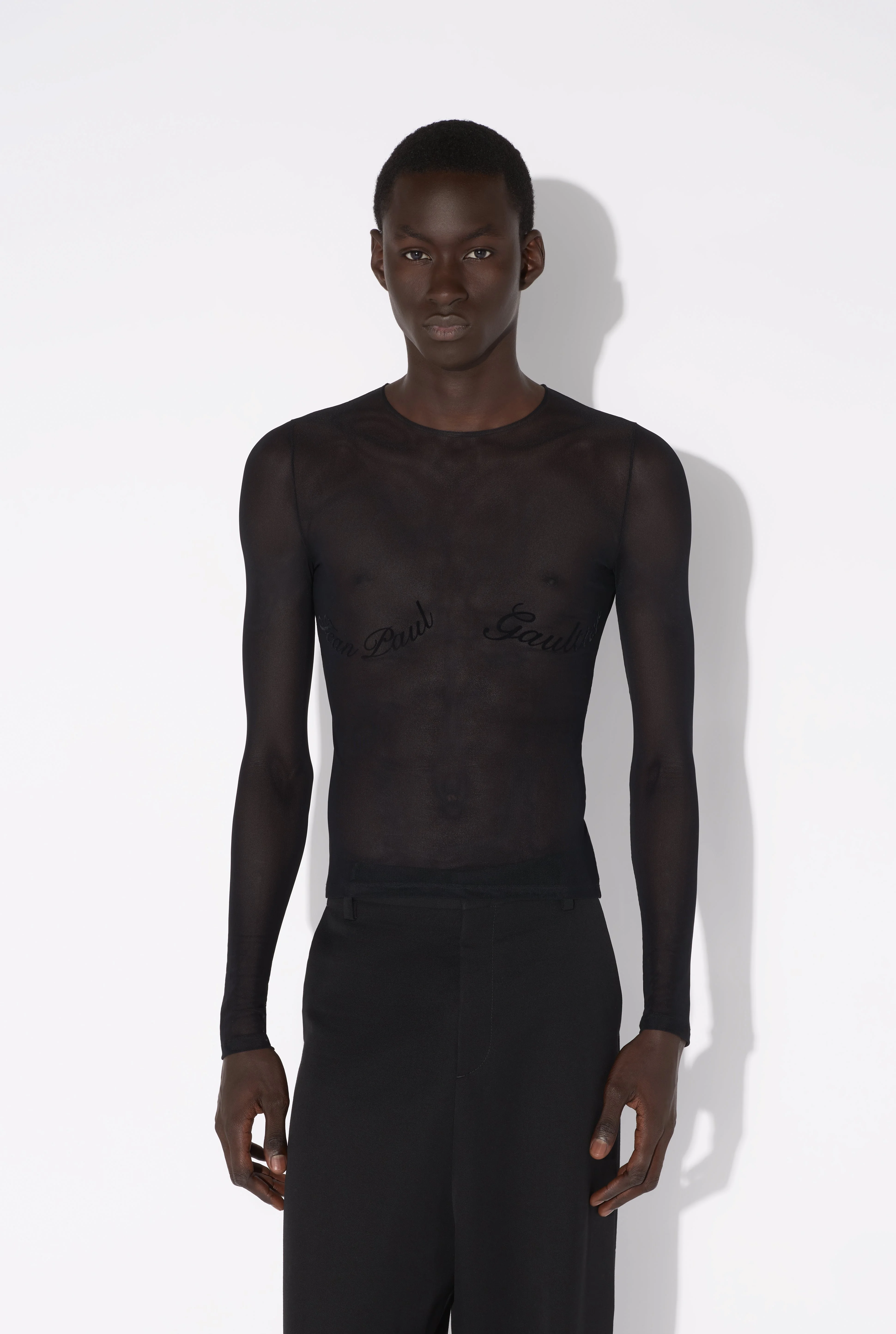 Long-sleeved draped black tulle top with flocked velvet Jean Paul Gaultier logo detail. PRODUCT DETAILS - Tight fit - Crew neck - Stretchy material - Materials: 94% polyamide, 6% elastane - Made in Portugal - Reference: 25/33-F-TO263I-T005-00