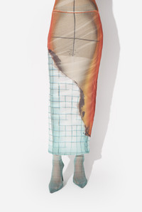 Long white tulle skirt with “Fire” print and draped lining. PRODUCT DETAILS - Tight fit - Stretchy material - Elastic waistband - Ankle length - Tulle lining - Mohair details - Material: 100% polyamide - Made in Italy - Reference : 25/03-W-SK007-M003P-150100