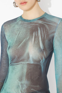 Long blue tulle dress with “Water” print. PRODUCT DETAILS - Tight fit - Crew neck - Stretchy material - Long sleeves - Tulle lining - Material: 100% polyamide - Made in Italy - Reference : 25/03-W-DR027-M004P-5557