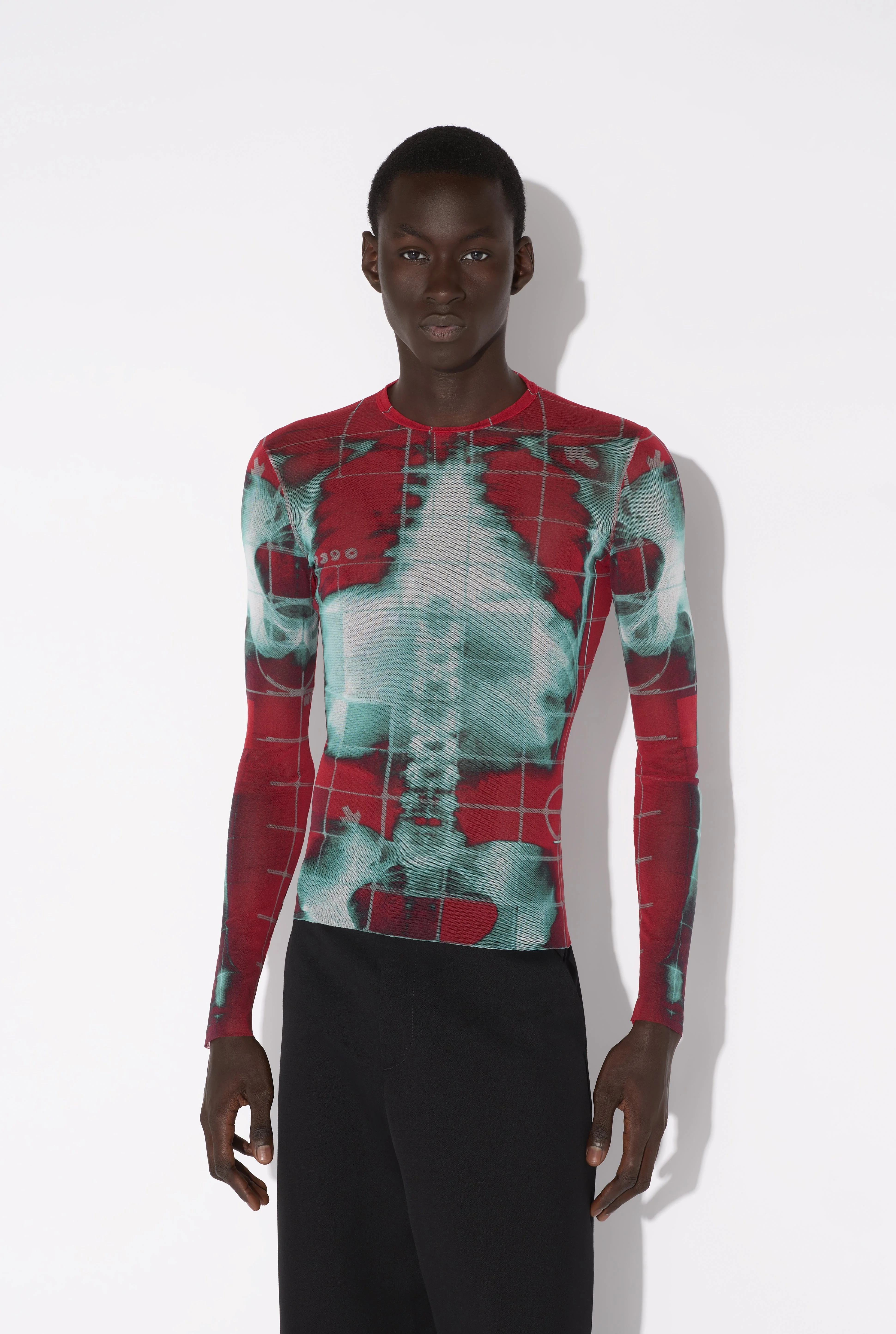 Red tulle top with “Squeletor” print. PRODUCT DETAILS - Tight fit - Crew neck - Stretchy material - Long sleeves - Material: 100% polyamide - Made in Italy - Reference: 25/33-F-TO241-T580-3058