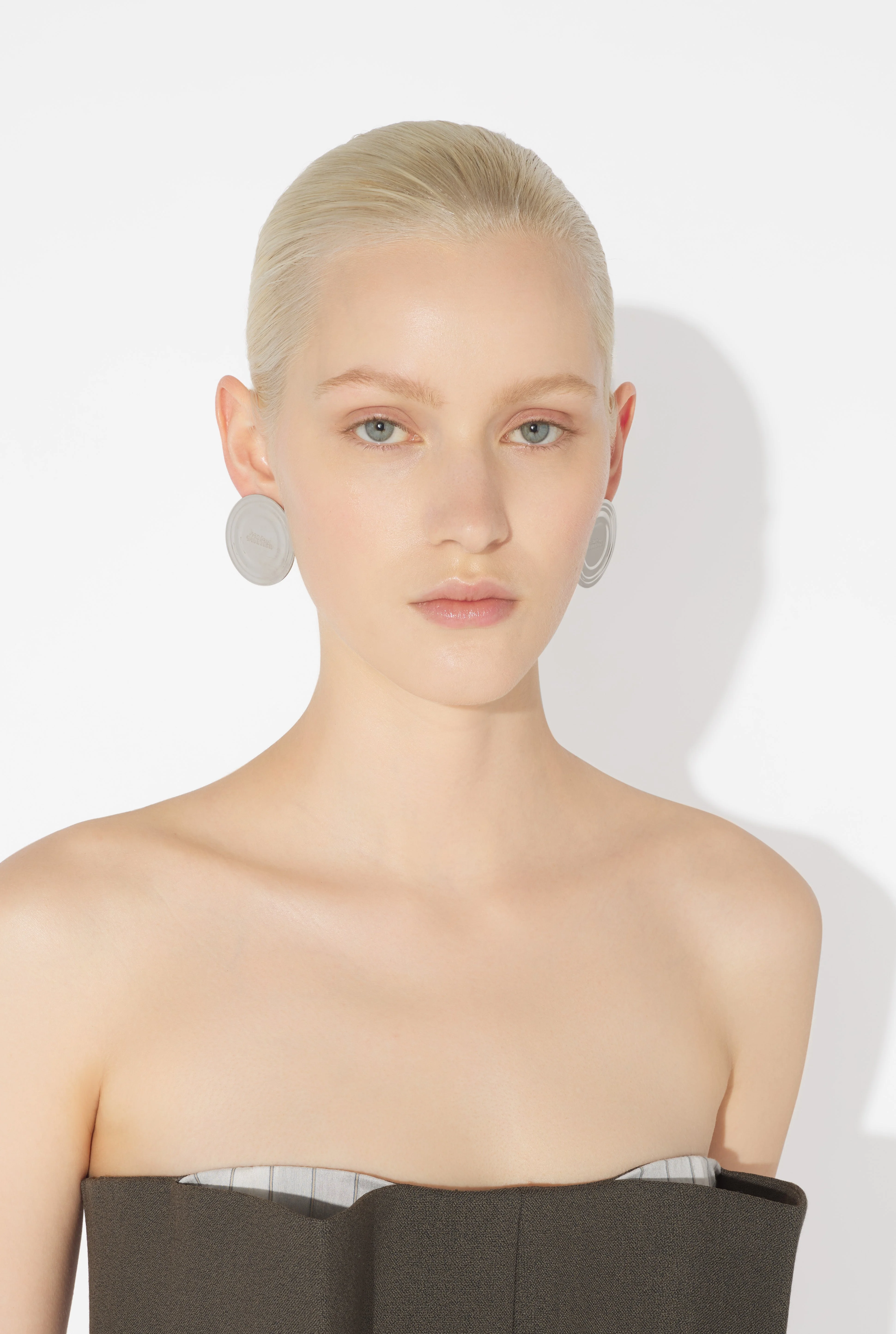 Silver-toned brass earrings in the shape of engraved Jean Paul Gaultier can lids. PRODUCT DETAILS - Sold as a pair - Push clasp - Material: 100% brass - Made in Italy - 25/04-W-JW035-X053-91