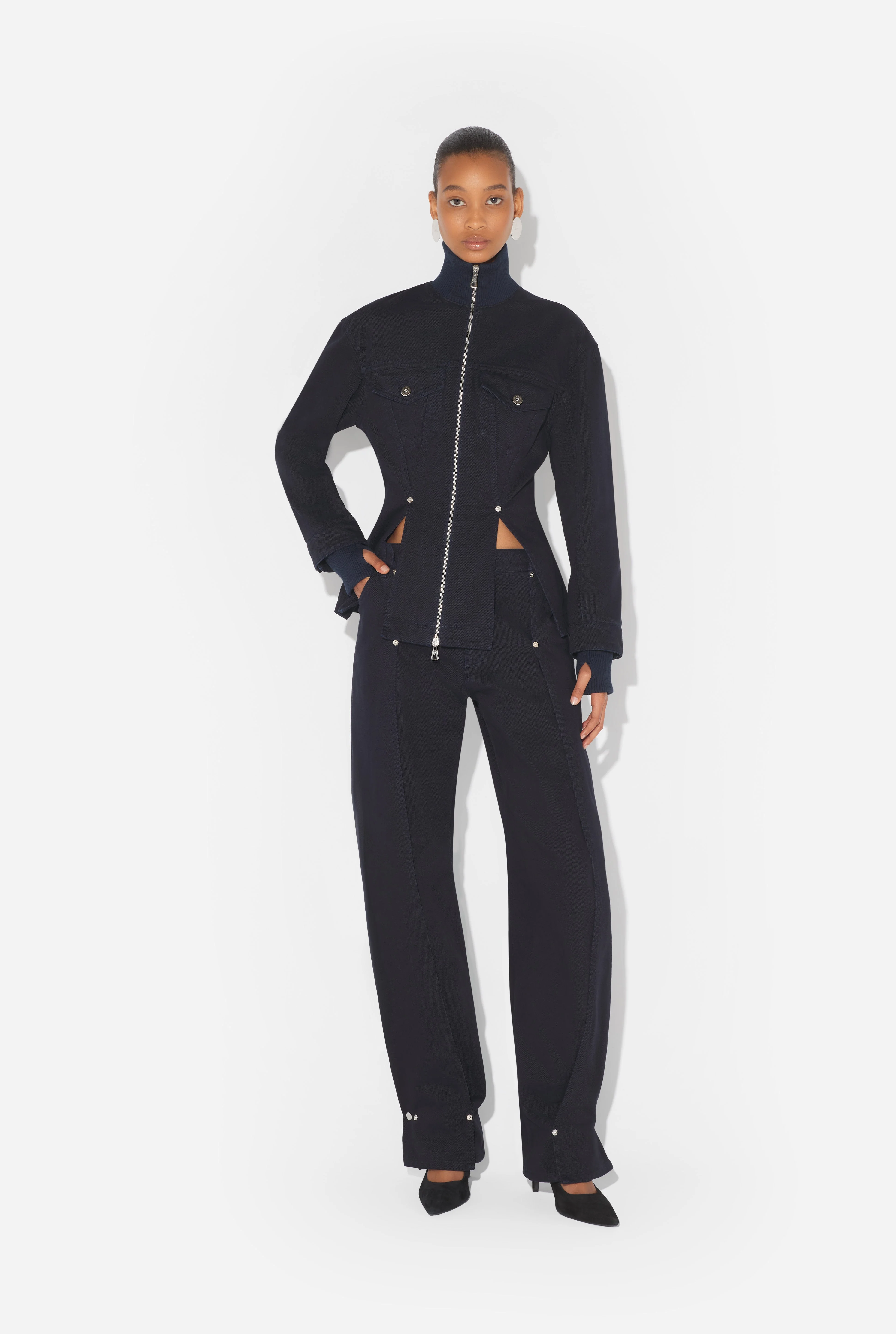 Navy denim jacket with slit details. PRODUCT DETAILS - Semi-slim fit - Ribbed cotton mock turtleneck - Ribbed cotton cuffs - Two flap pockets in front - Slit details in front - Double-sided engraved Jean Paul Gaultier zip fastening - Engraved Jean Paul Gaultier buttons - Engraved Jean Paul Gaultier rivets - Material: 100% cotton - Made in Italy - 25/04-W-JA011-W049-59