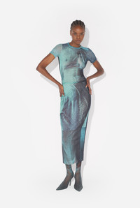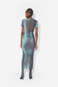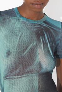 Blue tulle crop top with “Water” print. PRODUCT DETAILS - Tight fit - Crew neck - Stretchy material - Tulle lining - Material: 100% polyamide - Made in Italy - Reference : 25/03-W-TO313-M004P-5557