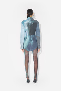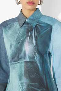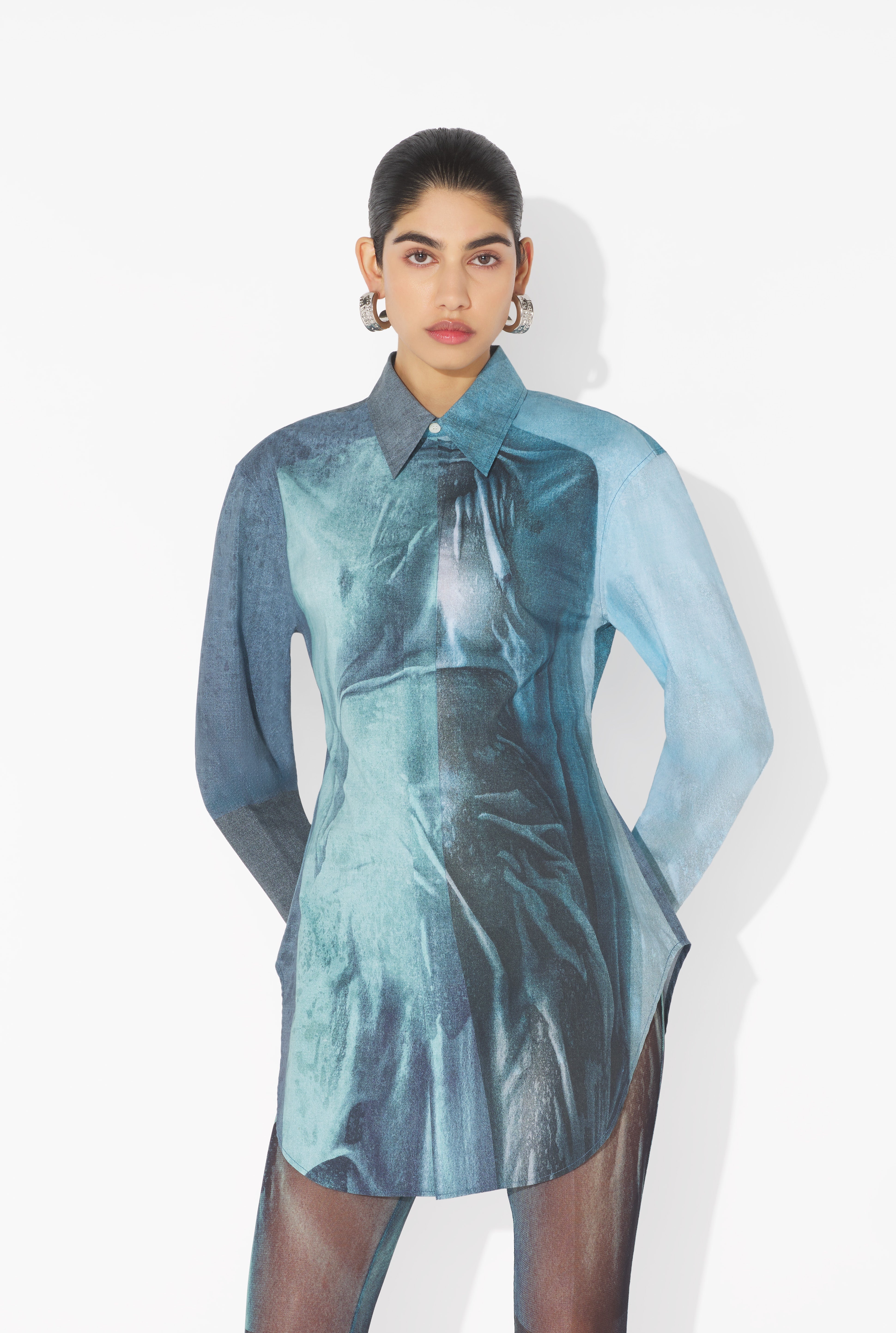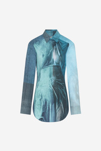 Blue cotton shirt with “Water” print. PRODUCT DETAILS - Fitted cut - Mother-of-pearl button fastening under placket - Mother-of-pearl cuff buttons - Materials: 97% cotton, 3% elastane - Made in Portugal - Reference : 25/03-W-ST031-W016P-5557