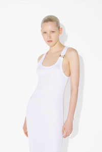 Long white ribbed cotton dress with engraved Jean Paul Gaultier piercing ring detail. PRODUCT DETAILS - Tight fit - Removable piercing ring with Jean Paul Gaultier engraving on left shoulder - Material: 100% cotton - Made in Bulgaria - Reference : 25/03-W-DR067-J014-01