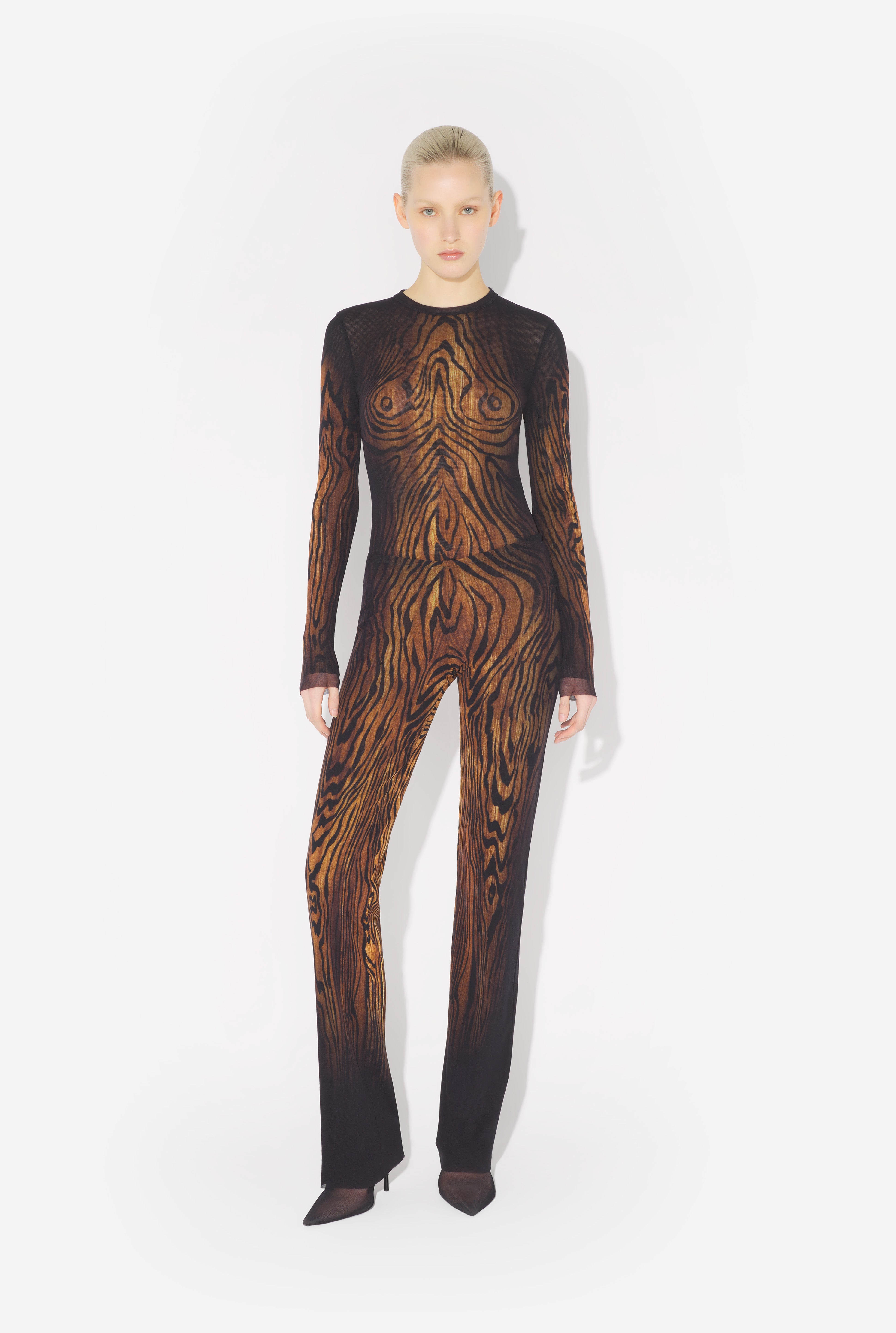 Black tulle pants with “Wood” print. PRODUCT DETAILS - Straight fit - Stretchy material - Elastic waistband - Tulle lining - Material: 100% polyamide - Made in Italy - Reference : 25/03-W-TR020-M002P-0060