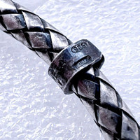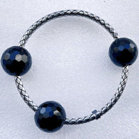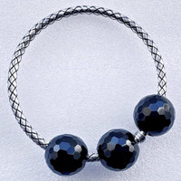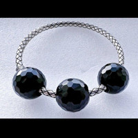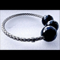 Bottega Veneta classic intrecciato textured Sterling Silver Bangle features three near opaque faceted onyx beads measuring approximately 17.8 mm each. The bangle slips on and wears beautifully solo or paired with another. •Made in Italy •Features designer signature and registered trademark number. •Weight: approximately 37 grams •Inside circumference: 7” •Vintage era bangle is in excellent condition with minor scratches to metal. •Ships with generic black velvet bag.