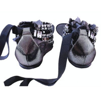 Casadei "Starlight" sandals deliver serious dazzle and plenty of bling. Skimmer flats are embellished with 8 rows of genuine Swarovski crystals in various hues of green, blue, gray, and black and fasten around the ankle with black grosgrain ribbon laces ties. Made in Italy. • Swarovski crystal adornment: 7" long x 3" high at center graduating to 1" on sides • Size 41 • Insole length: 10.25" • Insole width: 3.25" • Heels: 1/4" • Brand New in Box. • MSRP $1800
