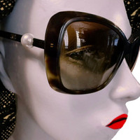 Authentic Chanel oversized sunglasses feature: •Brown tortoiseshell acetate frames •Gold-tone metal hardware interlocking CC’s with faux white pearl on each exterior arm •Left interior arm: 5303-H 714/S9 57 17 135 2P •Right interior arm: Made in Italy Polarized •Each upper lens is embedded with “Chanel Polarized” •Serial # on right lens: BC6460139 •Ship with Chanel keeper bag and Chanel quilted case. Sunglasses are in very good condition with minimal scratches to lenses that do not interfere with vision. Keeper bag and case show minimal wear but are not perfect.