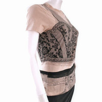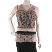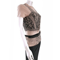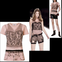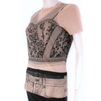 Vintage Christian Dior x John Galliano T-Shirt with Tromp L'oeil print done in hues of faded coral pink and charcoal. A theme that dominated the Dior Spring/Summer 2006 runway inspired by the black-lace-over-nude dress (Dior Couture) that Kate Moss wore to the CFDA awards that summer. Made in Italy Size 42 Shoulders: 14" Chest: 17" Waist: 27" Length: 24.5" Bottom edge across: 15" Pre-owned T-shirt is in excellent condition. *Measurements are provided as a courtesy and not a guarantee of fit.* October 3, 2005 vogue.com "Was that why John Galliano was on his best behavior? No silly pranks, breakneck platforms, scary makeup, or crazy, colliding references this season. Instead, what he proposed was a businesslike program for maximizing the potential of a single idea in his last couture collection: the black-lace-over-nude dress that Kate Moss wore this summer to the CFDA Awards."