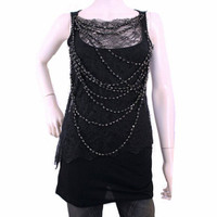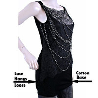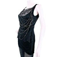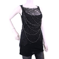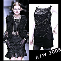 Givenchy Paris x Ricardo Tisci, 2008 Fall season, black cotton sleeveless top is embellished w/lace & 11 lavishly draped beaded strands with each bead encased in a gunmetal base. •Front lace is sewn/attached from neckline to below armpit and hangs loosely down the front with the beaded strands keeping it in place. •Size S •Chest: 28” •Waist: 29” •Length: 28.5” •Fabric: 100% Modal Base-semi stretchy •Lace front: 80 Nylon/20Viscose •Chain necklaces: Acrylic •Item/Model # 10A 7983 750 •Pre-Owned top is in excellent condition with minimal wear *Measurements provided as a courtesy and not a guarantee of fit*