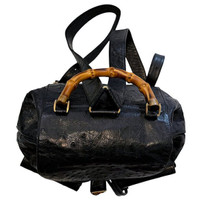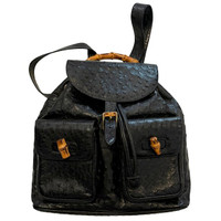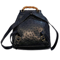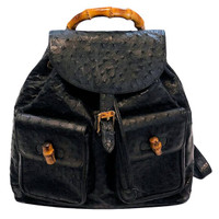 Authentic Gucci backpack from Tom Ford’s reign, is done in rich black Ostrich skin with bamboo accents and logo-embossed brass-tone metal hardware. Perfectly timeless, combining the strength of ostrich skin with the impression of precious bamboo, it is the ultimate in luxury acquisitions. • Dual adjustable shoulder straps • Single bamboo top handle • Dual pockets at exterior with flaps and turn-lock closures • Drawstring closure at top • Flap w/buckle closure at front • Diamante Jacquard Twill Lining • Single pocket at interior wall with zip closure • Height: 13” • Width: 12” • Depth: 3.75” • Shoulder strap drop: 7-9” • Length of shoulder straps: 18” with four pre-punched holes • Top bamboo handle drop: 2” • Made in Italy Perfectly sized for an overnight escape or shopping spree, wherever... it is most definitely carried over the shoulder for a touch of prestige. Backpack is in very good condition, with slightly relaxed sides and minimal residue. Please review all photos as they are an important part of the description. Ships with Gucci dust bag.;