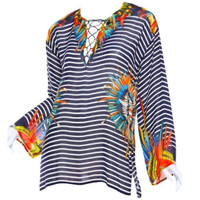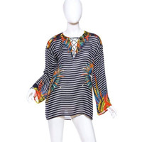 Jean Paul Gaultier's signature French sailor stripes with a bright parrot feather print added to the outer extremes is a fabulously fun look for day or apres swim. The tunic top features a V-neck with lace-up ties done in multi-color twists and beaded accents. Made in a lightweight semi-sheer rayon viscose that drapes beautifully on the body. Side slits Signature pull-tab at upper back Country of Origin: France Size L Shoulders: 21” Chest: 20” Waist: 32" Arms: 20” Length: 27” Vintage top is in very good condition with minimal wear. Early 2000’s *Measurements are provided as a courtesy and not a guarantee of fit*