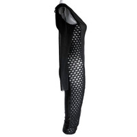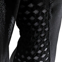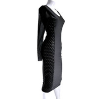 Jean Paul Gaultier Soleil body-con LBD with sheer sleeves, crochet side panels, and topstitched seams. Done in a polyamide stretch fabric with spandex for an ultra body-hugging look that is more forgiving than it appears. Fabric is a medium weight perfect for wearing 9 months out of 12. Made in Italy. Size Medium Chest: 28 - 30" Waist: 22 - 26" Hips: 29 - 32" Sleeves: 23" Length: 44" The dress is in pristine condition - never worn.