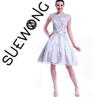 NWT Sue Wong Rhinestone Embellished White Lace & Ribbon Knee Length Dress #512