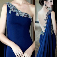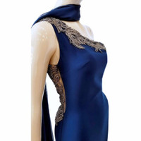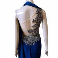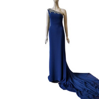 Queen of the castle? Of course you are in this Tarik Ediz 1-shoulder evening gown. Walk like a royal leaving open mouths gaping in your wake. •Bodycon smooth bodice fit from bust to below the hips moves into slightly flared skirt and full-length hem. •Sheer chiffon fabric extends from the right shoulder to an exaggerated sweeping train. •Fine sparkling detail trims the asymmetrical neckline. •Jewel embellished nude mesh back. •Color is a hue of navy blue. Size 38/US6 •Please refer to Tarik Ediz official size chart in photos •Worn once, dress is in very good condition. #redcarpetworthy, #elegance, #metgala, #luxury, #statementmaking, #sophisticated, #confidentwoman, #timeless, #beautiful, #unforgettable, #specialevent, #daring, #glamourous,