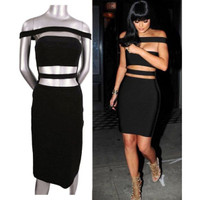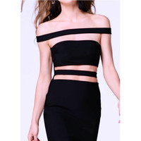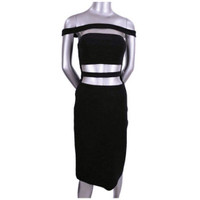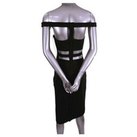 A stretch bandage-style dress with prominent cut-outs is for those who have it and want to show it off! Tarik Ediz's "Karessa" party dress is made from a stretch poly fabric that holds the body in all the right places. Illusion fill directly below off-the-shoulder neckline dress features a padded bust and concealed left side zipper. Size 34/2 • Chest: 13" • Waist: 26" • Hips: 30" • Length: 39" • Brand New w/Tags! *Measurements are provided as a courtesy and not a guarantee of fit*