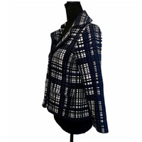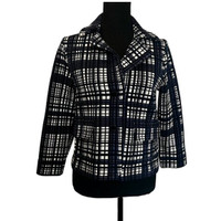 Tory Burch Navy Plaid Single Breasted Jacket with lavender, ivory and black accents in an abstract windowpane pattern. Blazer style jacket is soft and cozy chic. Perfect for transitioning seasons. •2 front snap close with logo embedded buttons for cover. •2 front pockets w/flap close •Unlined •Stretch cotton-blend fabrication: 80% Cotton, 18% Nylon, 2% Spandex Size S •Shoulders: 15” •Chest: 17” •Length: 20” •Sleeve length: 19” Jacket is in pristine like new condition. *Best recommended to know what size you wear in Tory Burch in this silhouette*