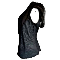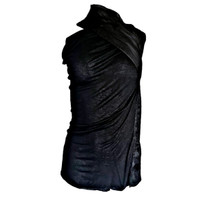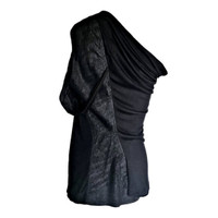 From Naska S/S 2012 Collection, Rick Owens body conscious one-shoulder/strapless top in Pristine condition. Never worn! Done in signature distressed material, and not to be confused with "worn out", top is gorgeous grunge with its variety of textures. The chiffon "strap" can be worn a couple of different ways either crossed over or left hanging to the side. The top features a single armhole on the left side. Made in Italy. Size 44 Chest: 32" Waist: 28" Length: 25" Fabric: 70% Silk, 20% Lamb Leather and 10% Rayon Viscose Rick Owens tends to run 1 - 2 sizes small; this piece in particular is not recommended for those with a large chest. Please know that I lightened a few of my photos so the details could be seen; Top is black in color. *Measurements are provided as a courtesy and not a guarantee of fit.