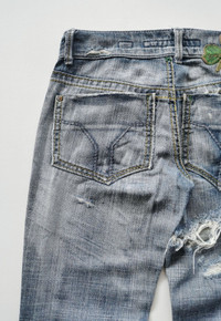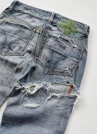 Manual waist 28. Stretch fabric. Distressed. Made in Tunisia. Used in good condition (see photos). ACTUAL INCH MEASUREMENTS IN LAID FLAT (also provided in photos). Waist - 14’ Hip - 17.5’ Front Rise - 7’ Thigh - 9.5’ Knee - 7.5’ Leg Opening - 7’ Inseam - 34.5’ Outseam - 43’ Inspect photos for defects before payment. All sales are final (no returns or refunds). Thank you for your understanding. Please contact us with questions. CODE : A250
