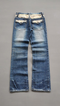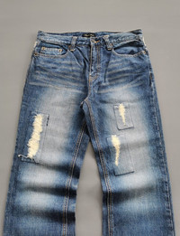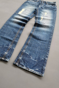 Size 31. Distressed reworked striped fabric. Button pocket back. Used in good condition no defects (see photos). MANUAL INCH MEASURE IN LAID FLAT (also provided in photos). Waist - 15.5’ Front Rise - 10.5’ Thigh - 10.5’ Knee - 8’ Leg Opening - 8’ Inseam - 31.5’ Outseam - 41.5’ Inspect photos for defects before payment. All sales are final (no returns or refunds). Thank you for your understanding. DHL express shipping. Please contact us with questions. CODE : A236
