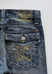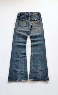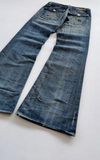 Manual waist 32. Flap button back pockets. Tribal R Logo stitching. Made in USA. Flare bootcut fit. Item are in good pre-owned condition. Flat measurements in inches (photos provided) Waist - 16’ Front Rise - 10’ Thigh - 11’ Knee - 8’ Leg Opening - 9.5’ Inseam - 34’ Outseam - 43’ Fast & secure DHL express shipping. Examine the photos for more details. Follow my shop to check daily updates & price drops. Thanks! CODE : A301
