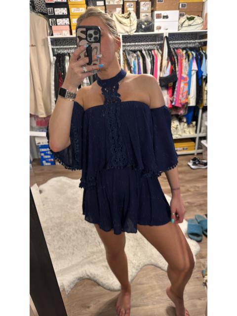 Indikah by Angel Biba Navy Crochet Trim Choker Neck Off Shoulder Jumpsuit