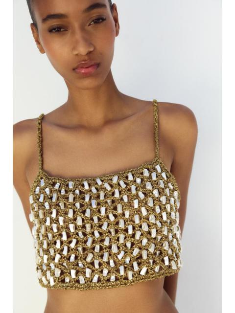 Zara Beaded Mother of Pearl Gold Crochet Embellished Crop Top
