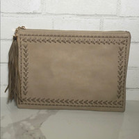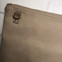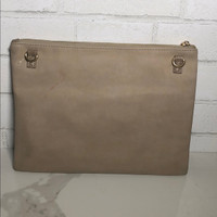 Lightly used. Can be worn as Crossbody or carried as a clutch. Adjustable strap. Interior zipper doesn’t work properly. Small mark on back (pictured) have not tried to remove. 11.5”x 8.5” Purchased from local boutique. Fast shipping 💌
