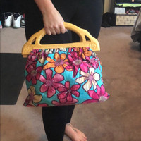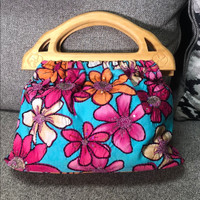 Mystique Boutique - Floral Beaded Fabric Handbag with Wooden Handles