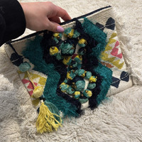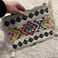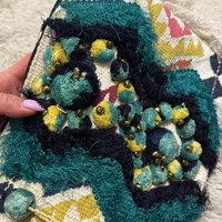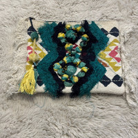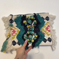 Parfois Embroidered Crochet Fringe Pom Pom Clutch