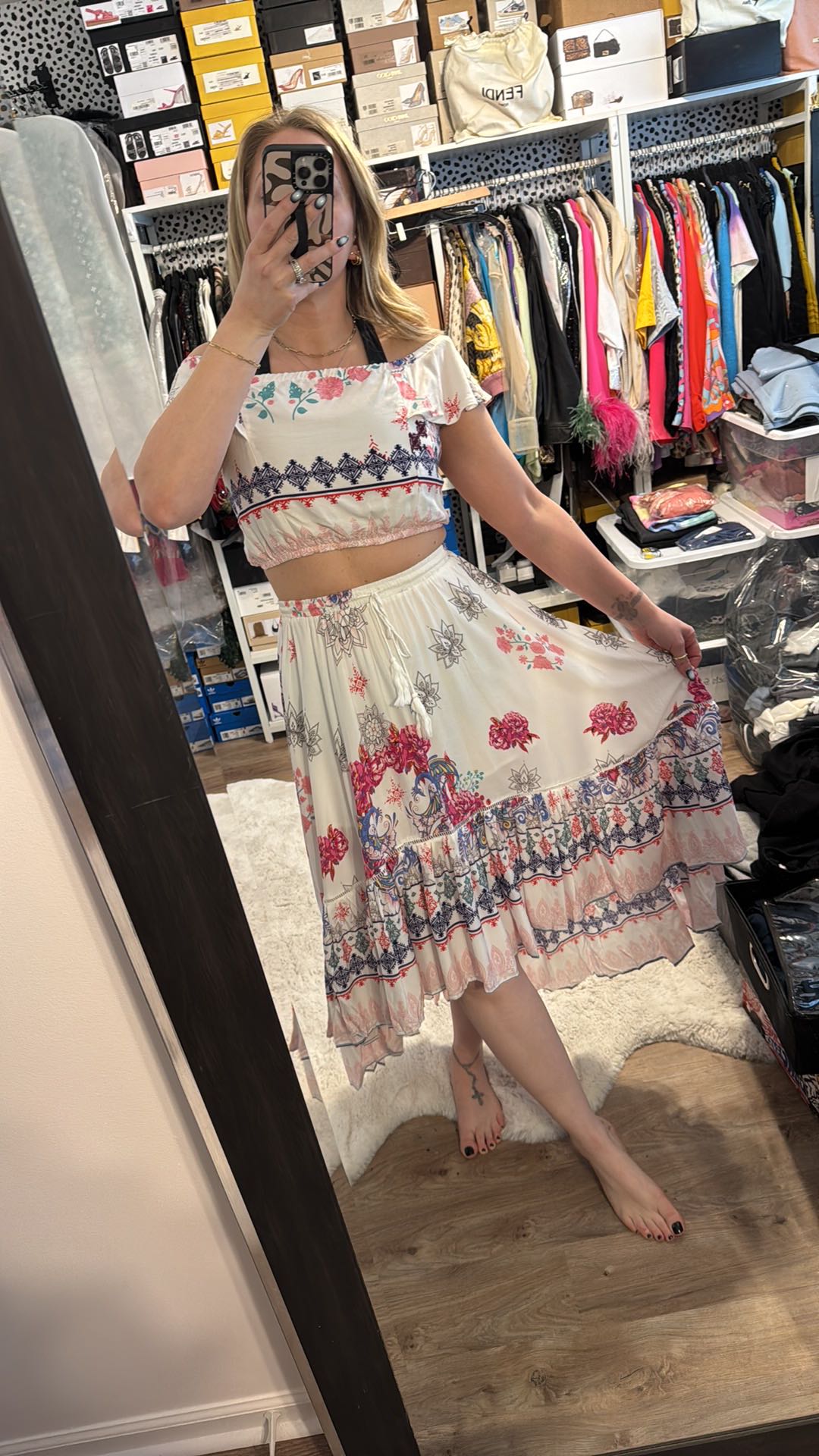 Spell Style Ruffle Boho Skirt + Crop Top Set π Worn Once, Slight discoloration on top (not noticeable) π Fast Shipping AUS π¦πΊ Sizing: Top 10 + Skirt 12 (Listed as M) π Approx Laying Flat Chest 17β Length 10 1/2β Waist 14β Length 26β - 38β